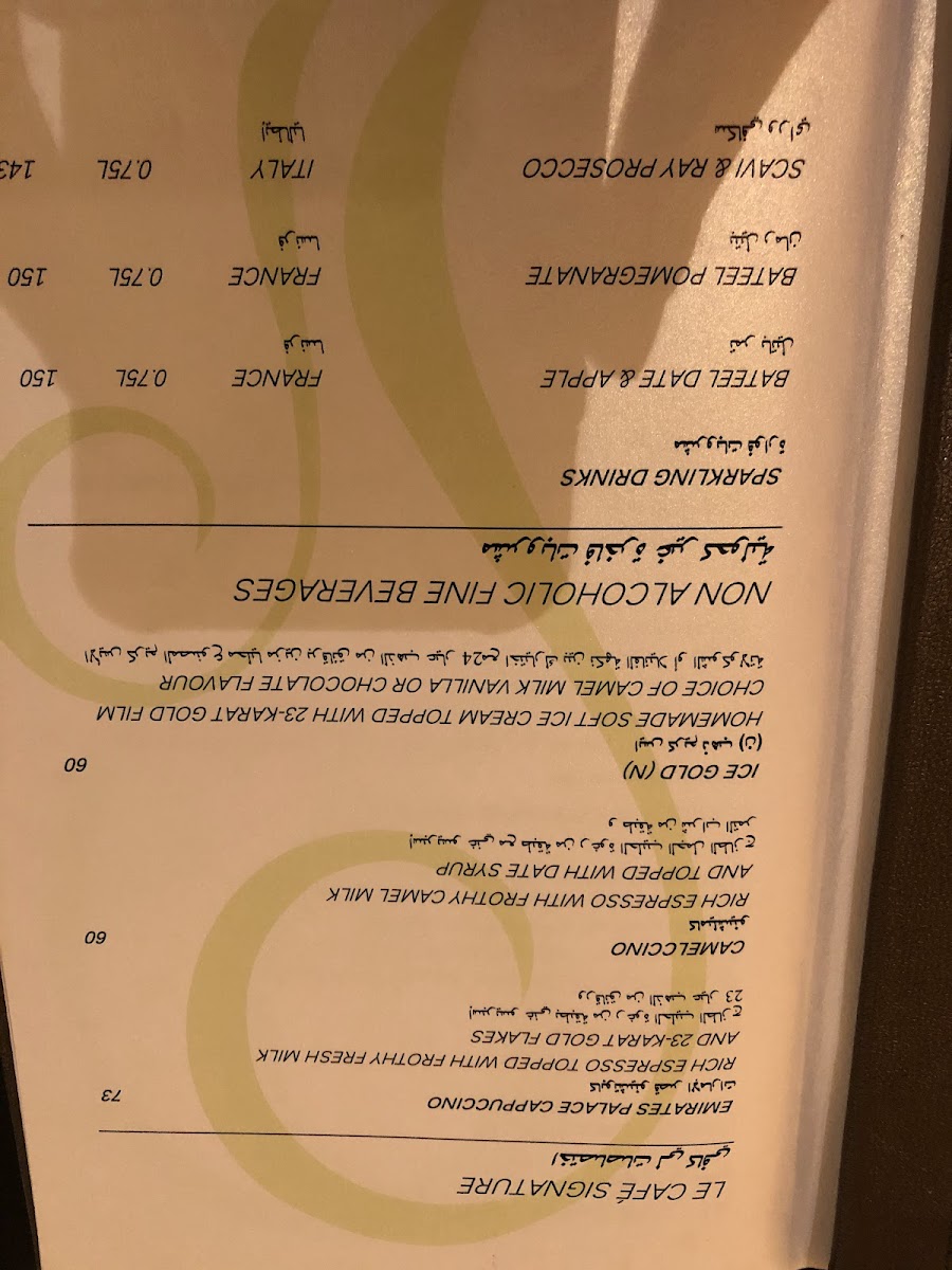 The menu at Emirates Palace Boutique features a range of coffee beverages, including specialty options such as cappuccinos with gold flakes and gold-dusted variants. In addition to coffee, the menu offers a selection of desserts and sweet treats, including cheesecakes, pavlovas with gold, and various cakes all decorated with gold details. Ice cream options are also available, including unique choices like camel milk ice cream served with traditional accompaniments.